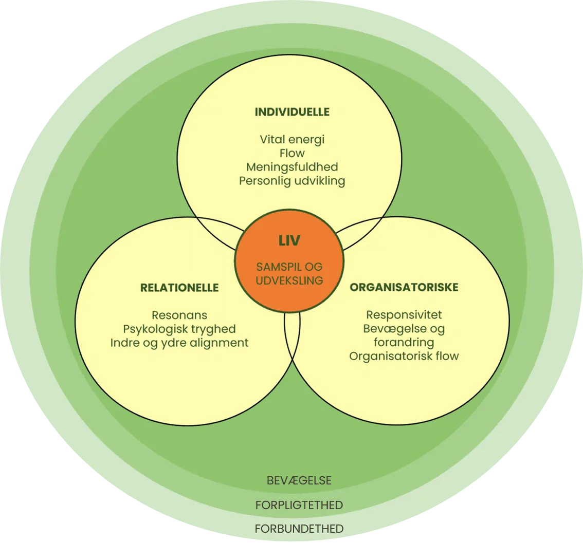 Når livsindikatorerne bringes i spil, opstår et gensidigt kredsløb mellem trivsel og vitalitet. Vital energi, resonans, tryghed og flow forstærker hinanden som levende kræfter i systemet. Mening og udvikling vækker engagement, resonans skaber bevægelse i relationerne, og responsivitet frigør den faglighed, der ofte ligger bundet i organisatoriske lag.
